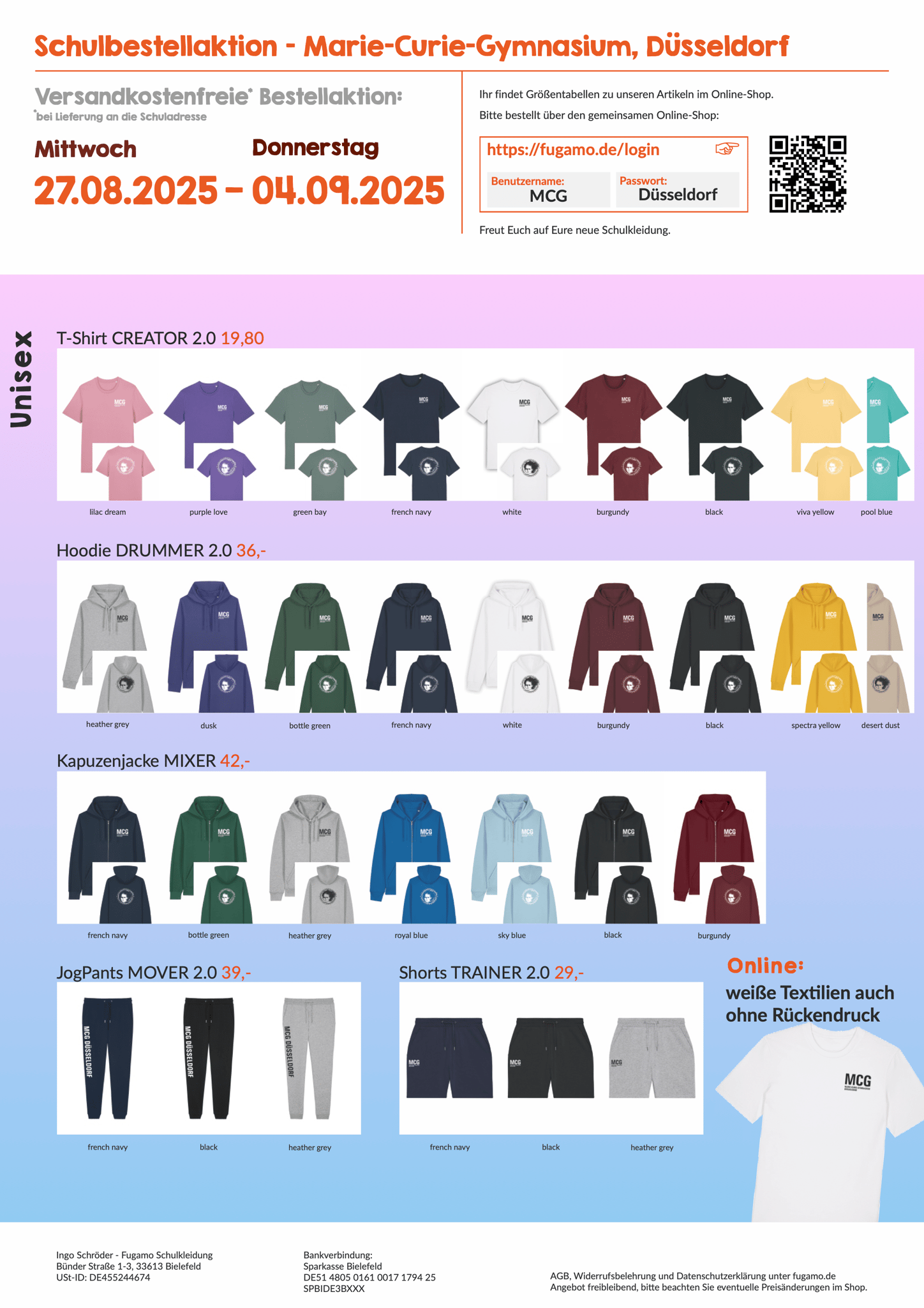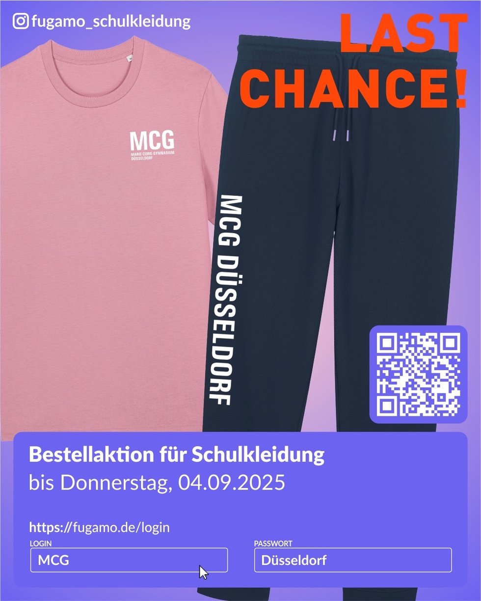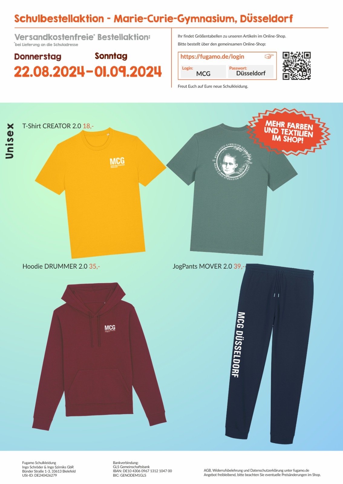 Und hier geht es direkt zum Schulshop (der Hyperlink funktioniert leider nur nach Klick auf 'Mehr lesen...'): https://fugamo.de/login/?user=MCG&pw=Düsseldorf